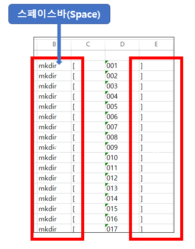 한번에 폴더명을 만들때는 파일명 하나하나 작성하기 힘들잖아요?!? 이럴 때 엑셀을 활용해서 명령어를 쭉 작성하시면 됩니다. 이때 주의할 점은 명령어가 mkdir 뒤에 스페이스바가 하나 들어간다는점! 엑셀에도 mkdir 뒤에 스페이스바를 한번 누르고 쭉 복사하시면 편하게 복사하실 수 있습니다.