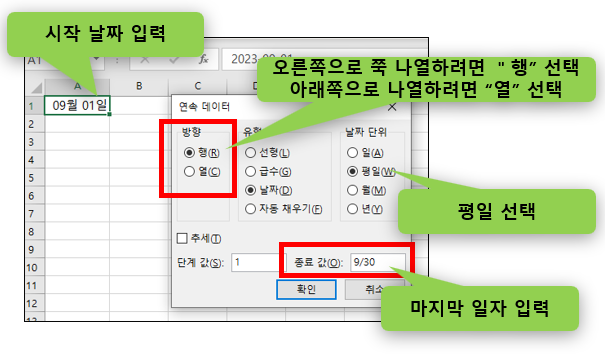 방법 1. 엑셀 평일만 입력하는 방법. 계열 탭 활용