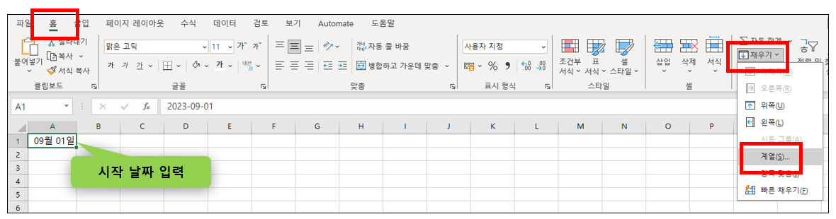 Step 1) 시작하는 날짜 입력 후 [ 홈 > 채우기 > 계열 ] 선택합니다.